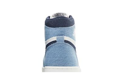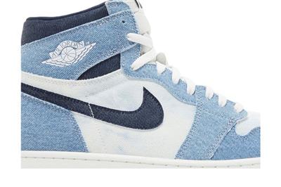 The Air Jordan 1 Retro High OG 'Denim' is crafted from breathable denim, featuring a white base lightly stained with indigo dye. Washed blue overlays reinforce the forefoot and heel, while Obsidian accents land on the signature Swoosh and high-cut collar. Branding elements include a woven Nike Air tongue tag and the iconic Wings logo stamped on the lateral collar flap. Anchoring the sneaker is a rubber cupsole, highlighted by Summit White sidewalls and a gum rubber outsole.